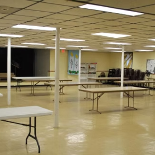 This large room is equipped with a small, elevated stage with simple lighting at the front of the room which works well for basic plays and presentations. Stackable plastic chairs and tables are available for use.
